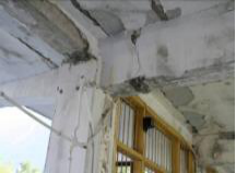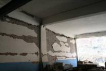 (c) 1层入口东侧填充墙倒塌,框架梁端破坏 |