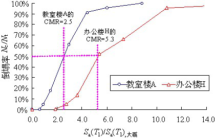 该方法需借助于模拟结构倒塌的非线性分析软件。基于THUFIBER程序和CMR分析所获得的漩口中学教学楼A和办公楼H的地震易损性曲线如图10所示。由图可见,教室楼A的CMR约为2.5,而办公楼H的CMR达到了5.3,超过教室楼A的CMR也达2倍以上,这进一步说明了办公楼H的抗倒塌能力显著高于教学楼A。